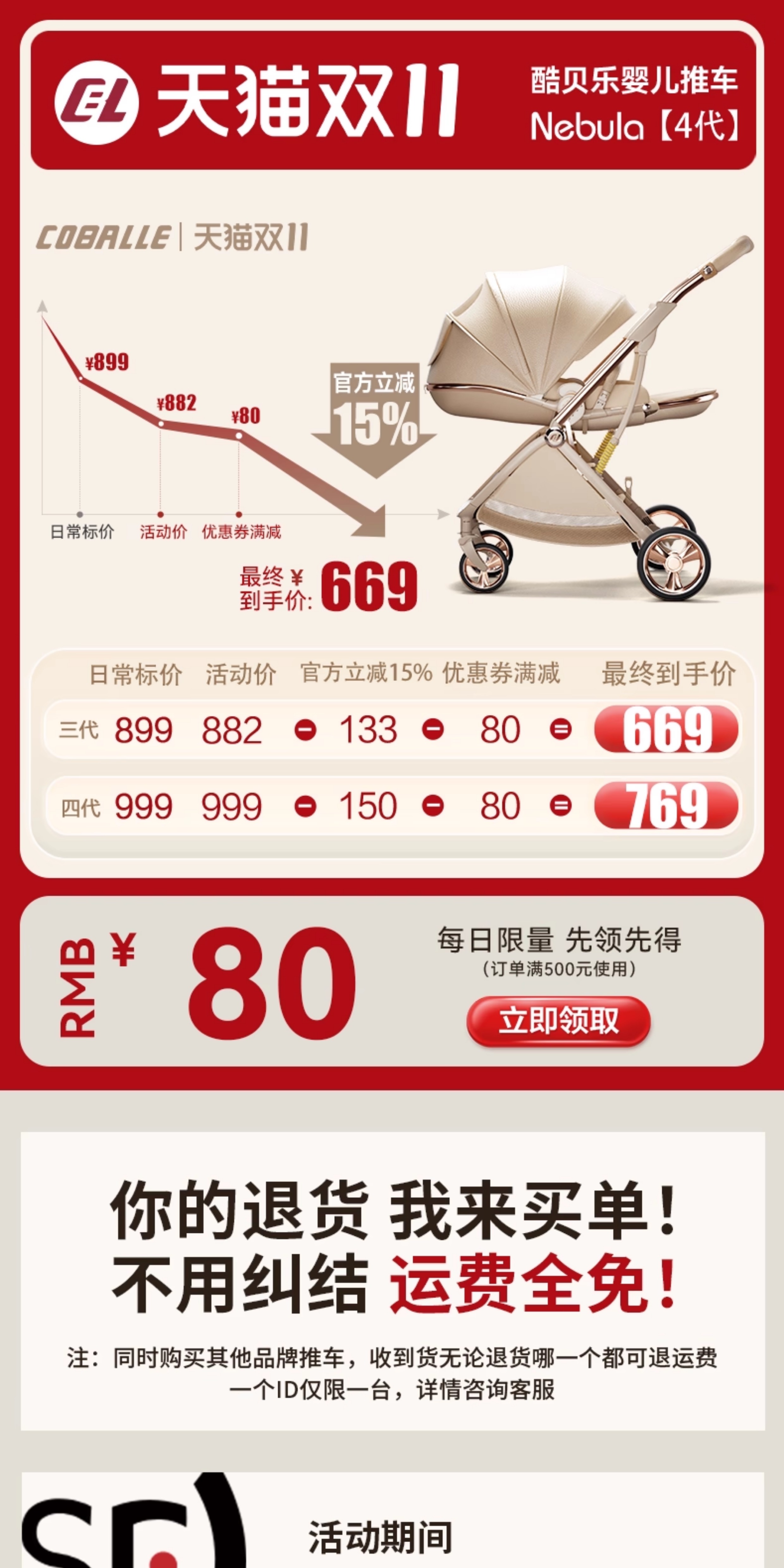 【双11】酷贝乐婴儿推车可坐可躺0到3岁轻便折叠幼儿童高景观双向