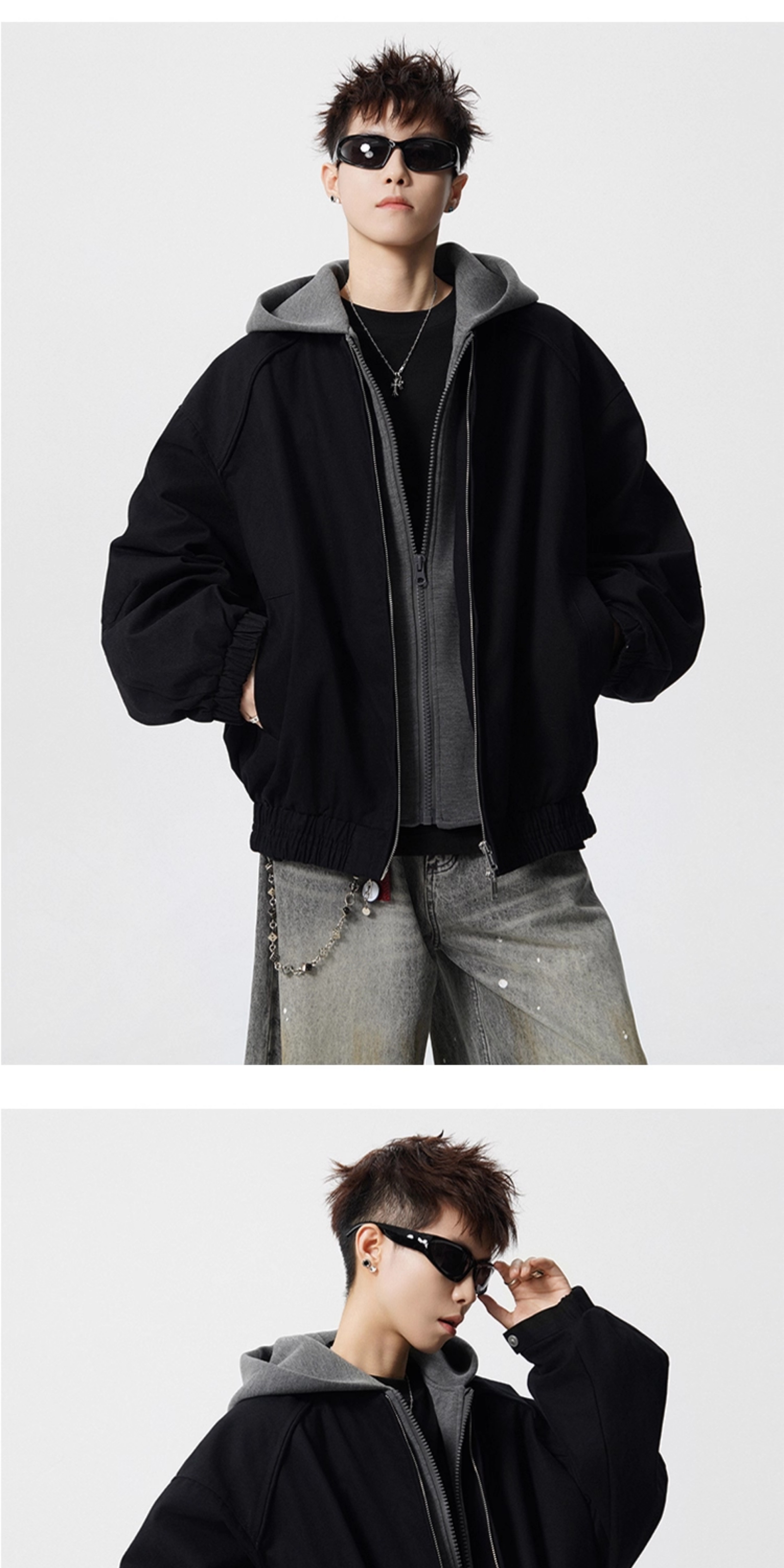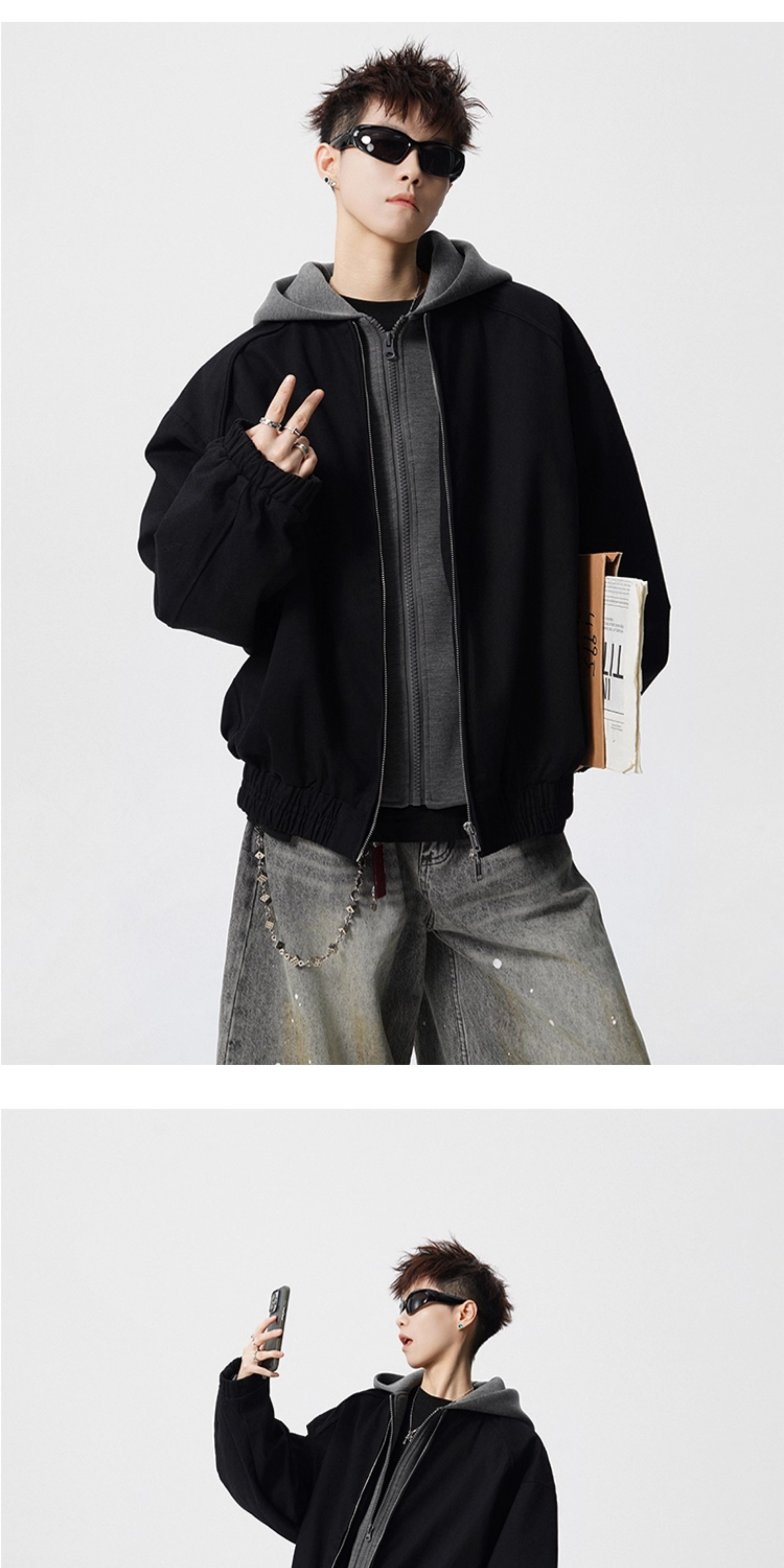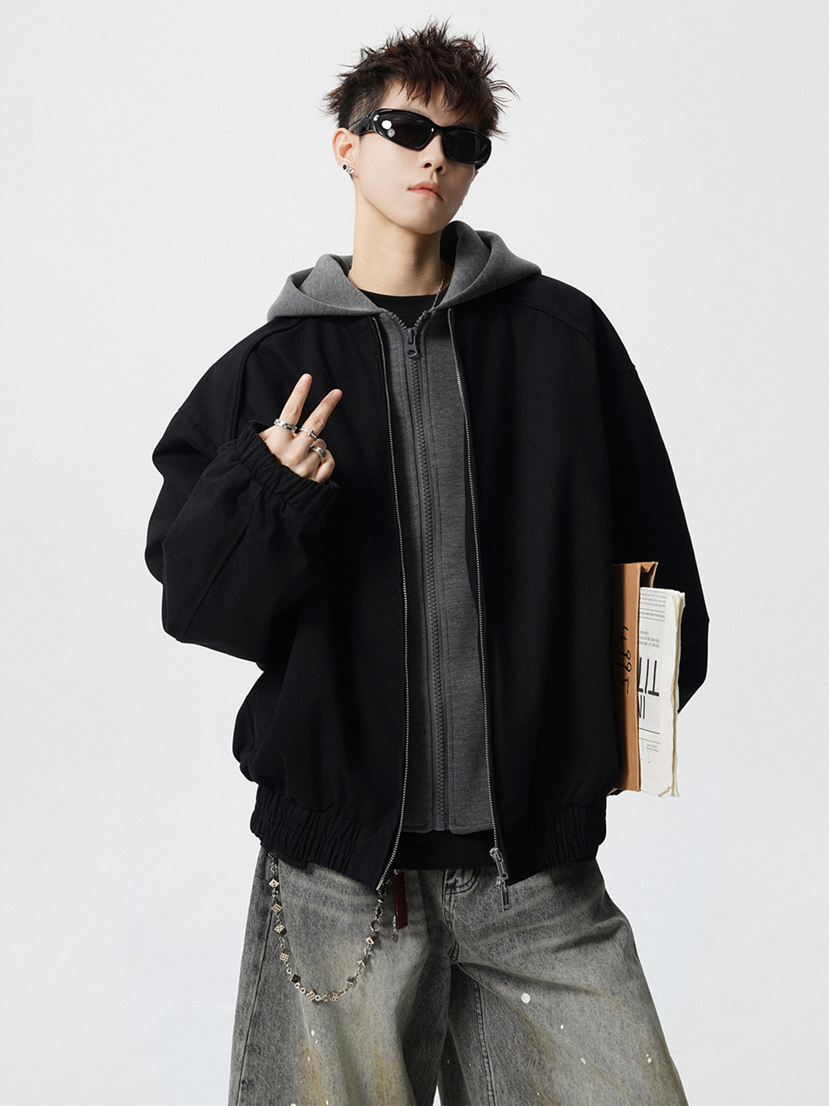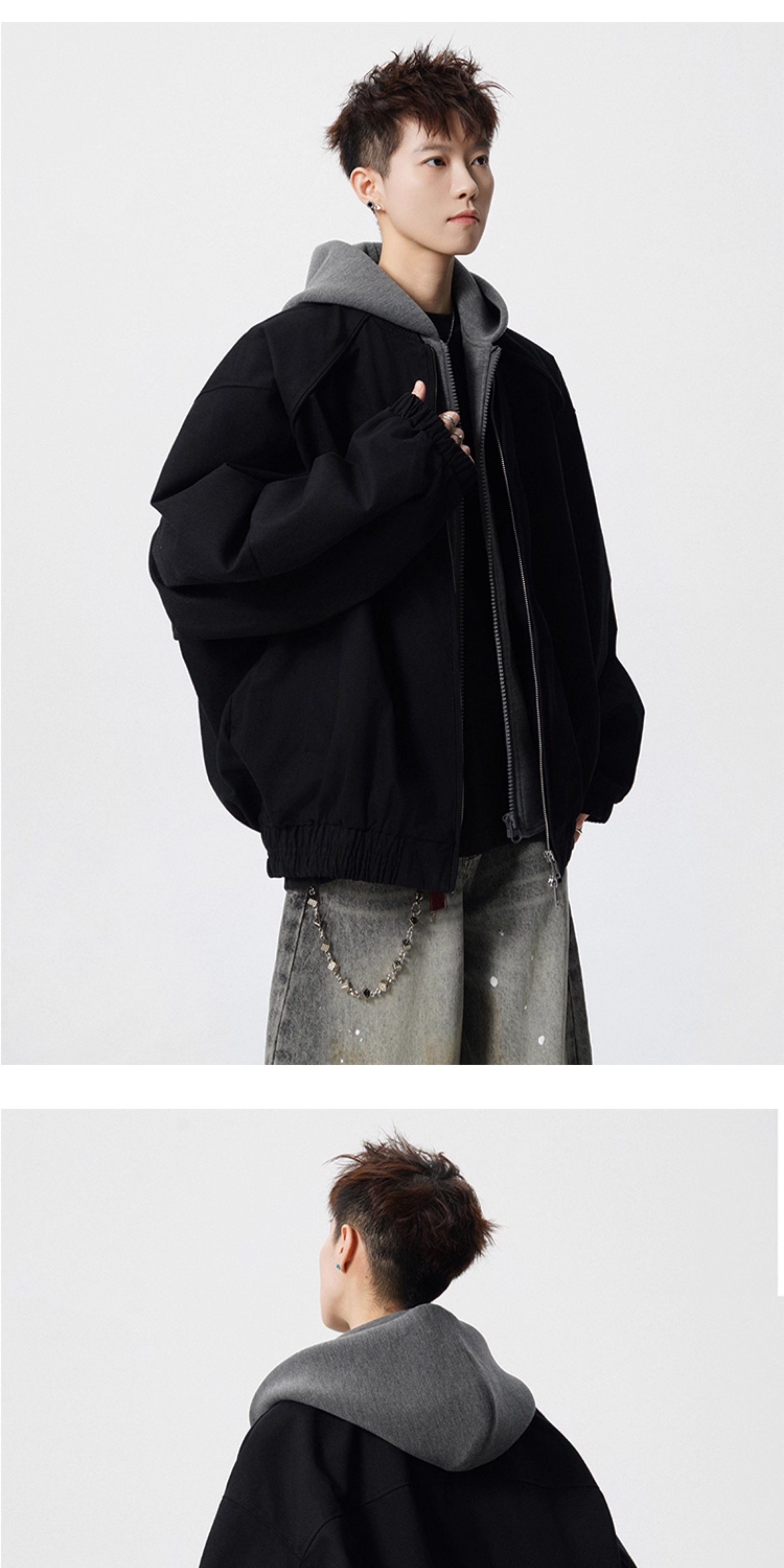 假两件撞色连帽外套男秋冬新款美式街头痞帅百搭休闲黑色飞行夹克