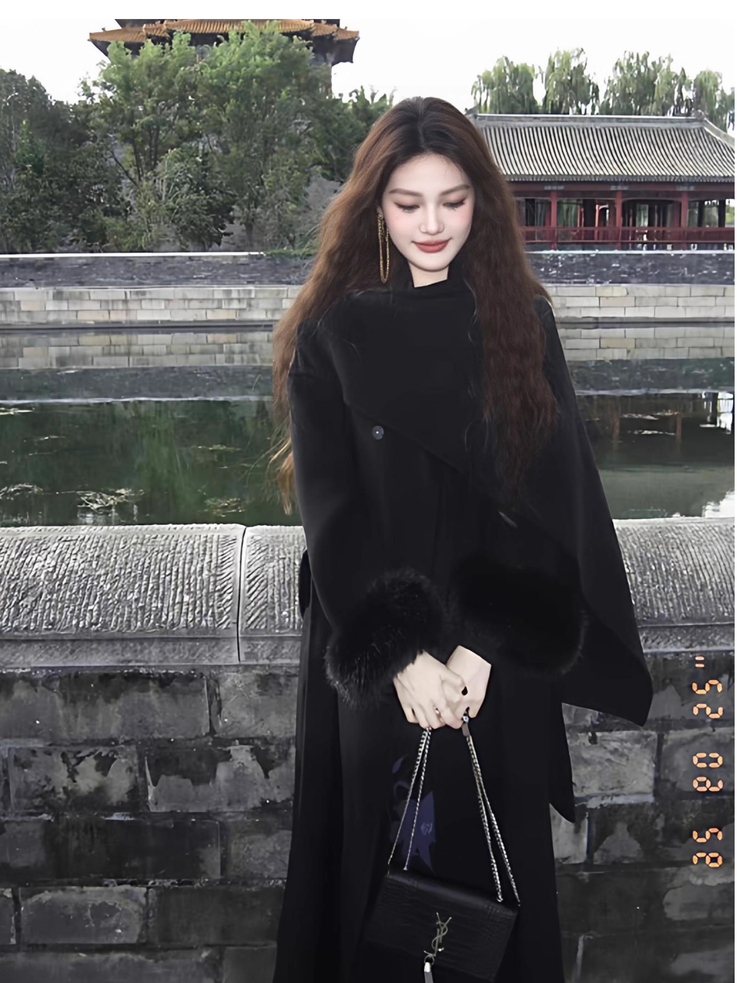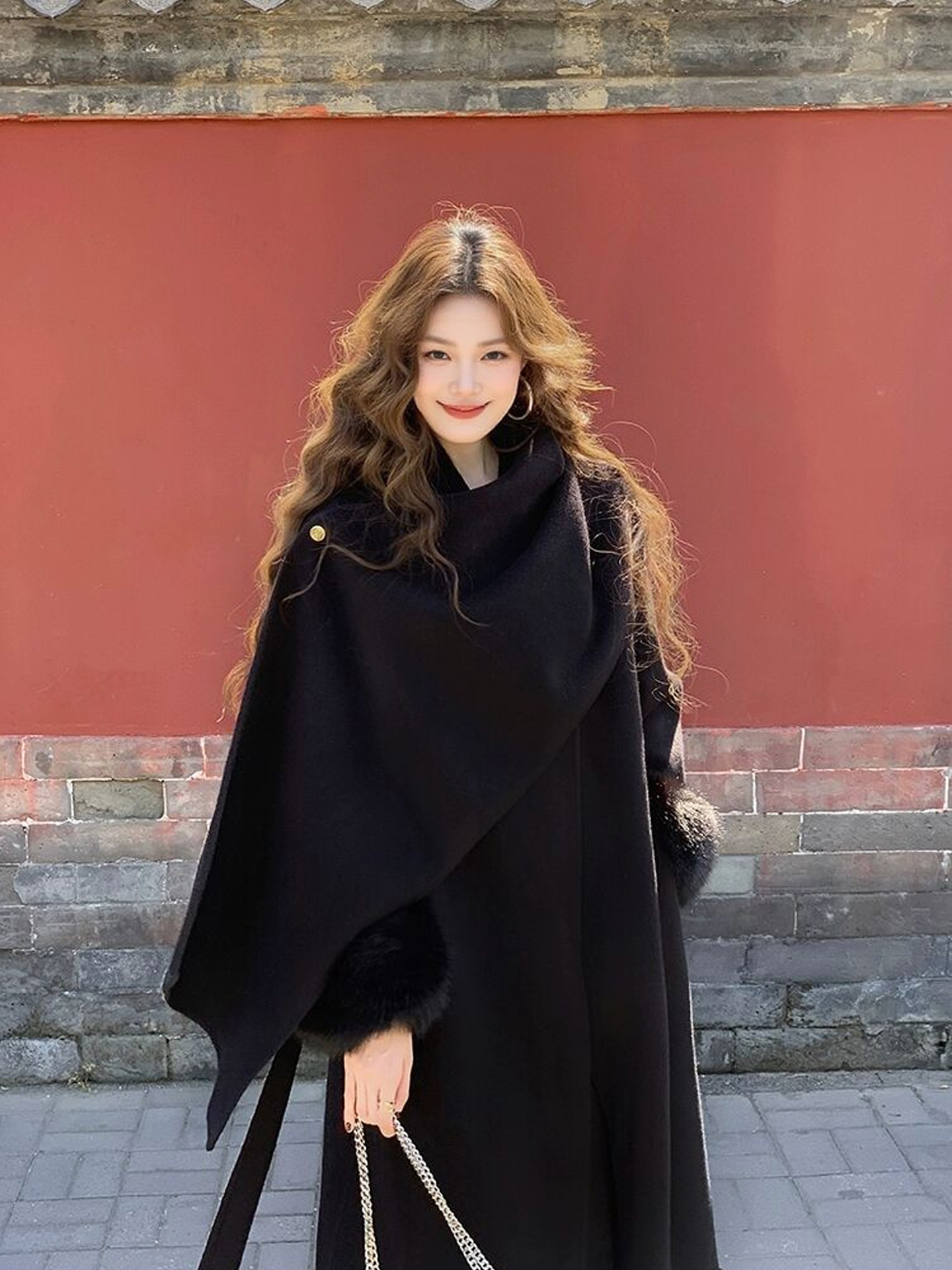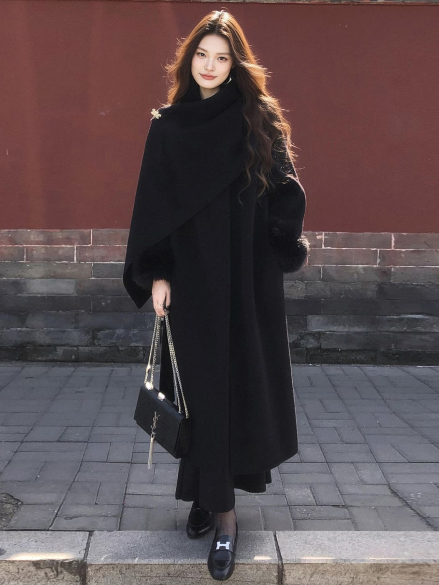 双面羊绒大衣女2025秋冬新款兜领围巾披肩狐狸毛袖全羊毛呢子外套