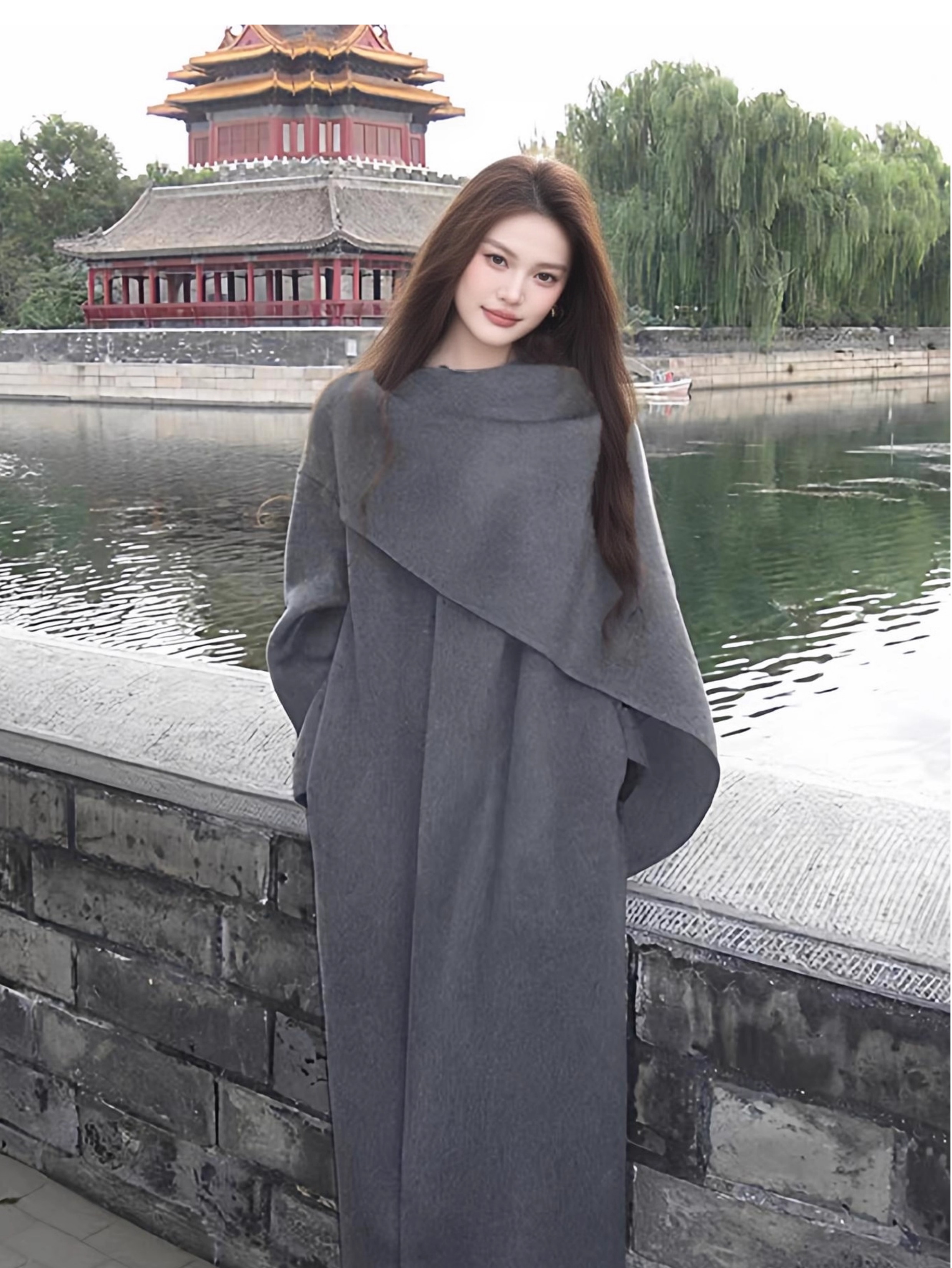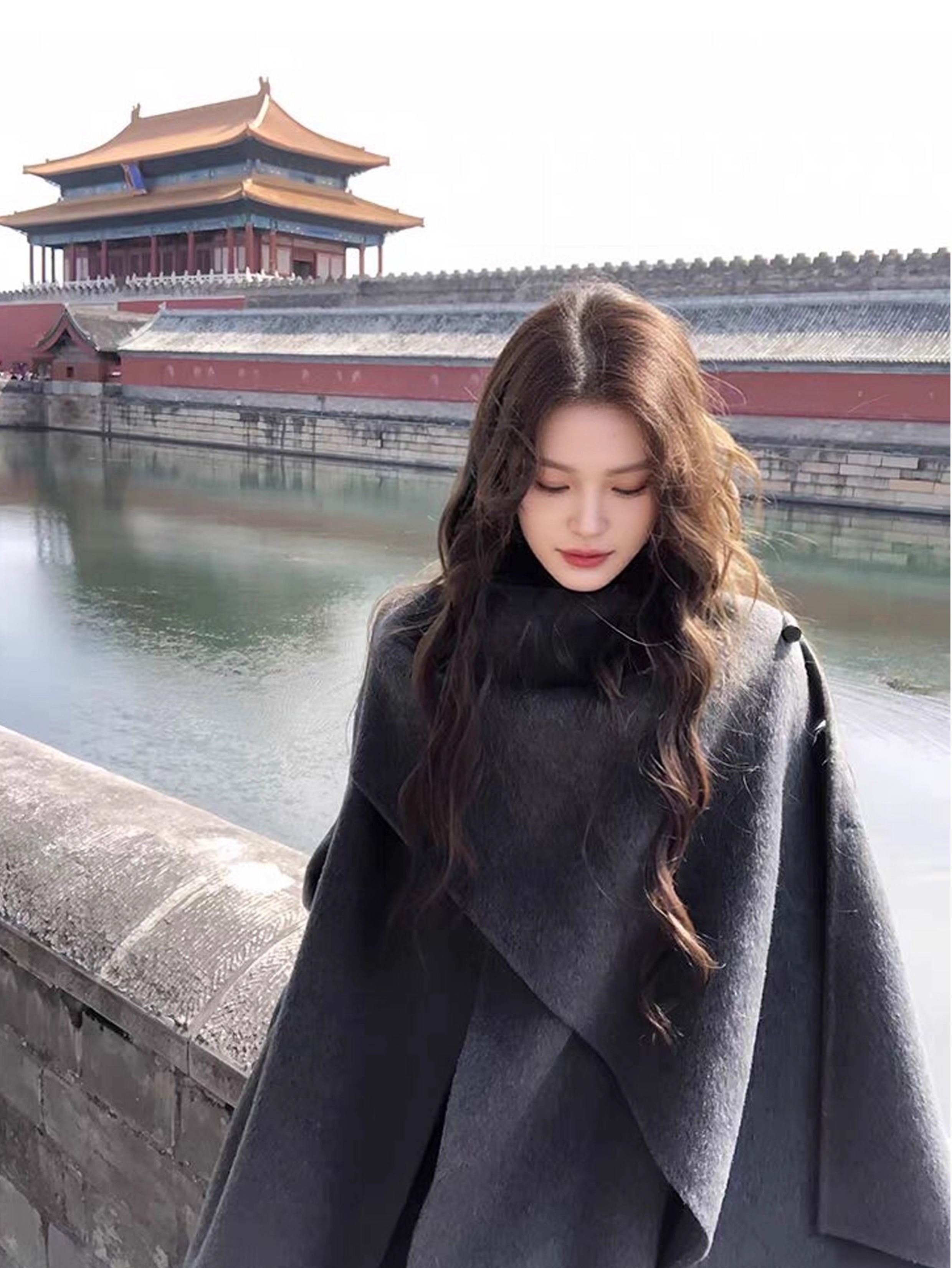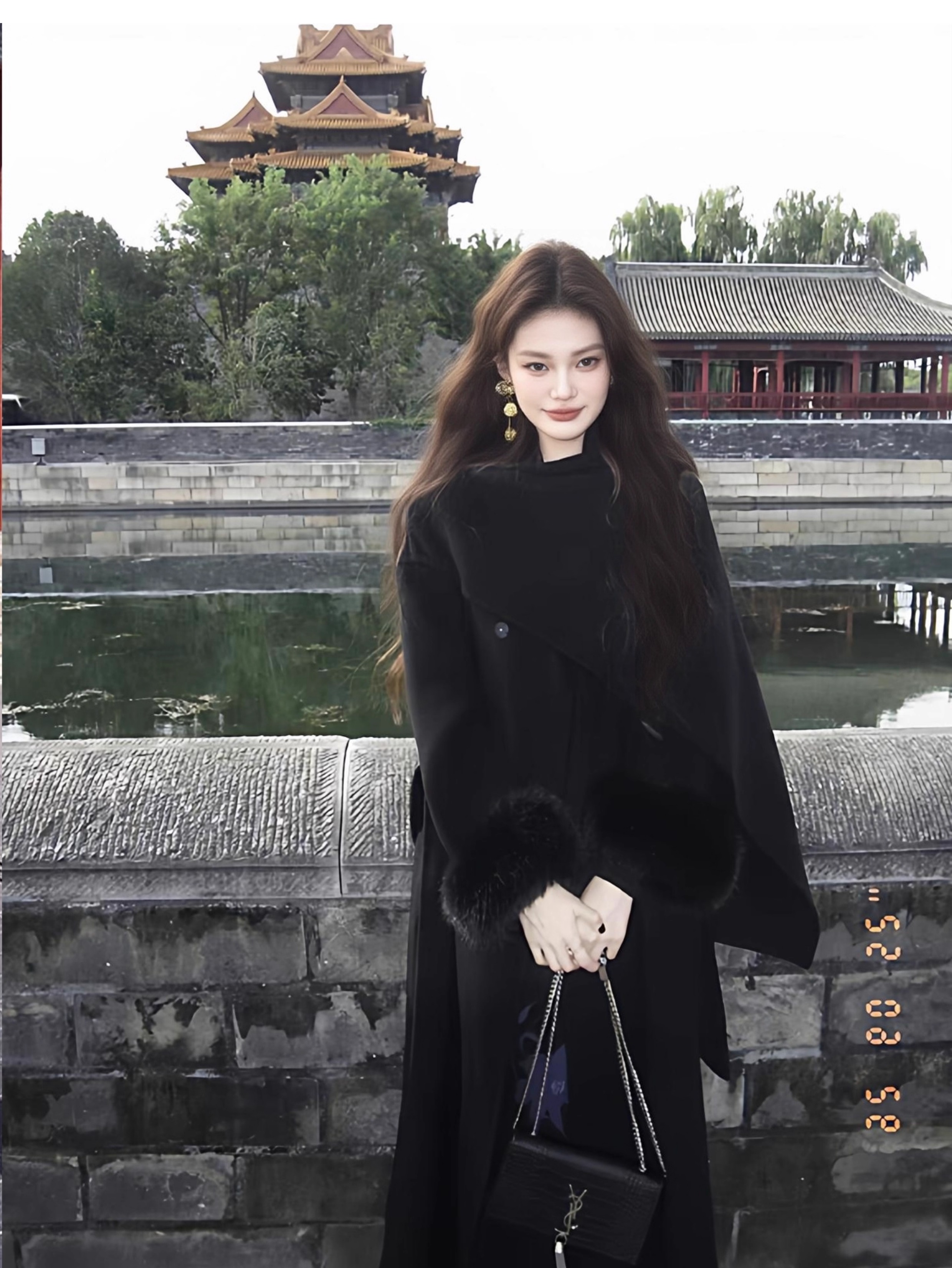 双面羊绒大衣女2025秋冬新款兜领围巾披肩狐狸毛袖全羊毛呢子外套